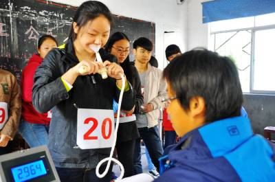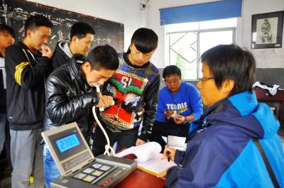 11月12日,云梦县教育局工作人员对该县梦泽高中的学生进行肺活量项目测试。教育部今年新修订的《国家学生体质健康标准》颁布后,我省从今年起对各级各类学校学生每年进行一次体质健康测试,测试项目包括身高、体重、视力、坐位体前屈、50米跑、1分钟跳绳、1分钟仰卧起坐等,其中规定,高中生、大学生的体质测试成绩低于50分将不能毕业。视界网周晓文摄