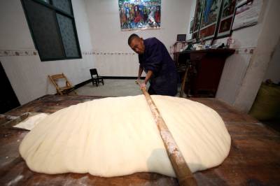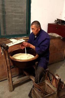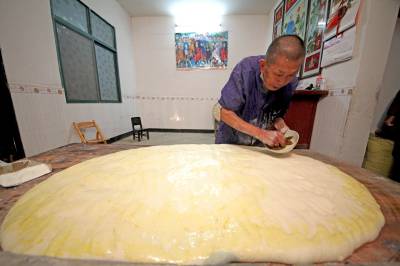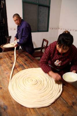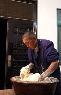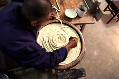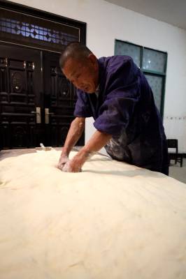 晚饭过后,大约5点半,张师傅将50斤面粉分两次加入紫陶盆,注入一定比例精盐调和的山泉水,边加边搅和,直至软硬适度,即“和面”。将面团密闭静置一个多小时,然后将和好的面浆倒在面板上,用竹杠揉压,用手搓揉,再摊成3厘米厚的面皮,均匀涂上一层上好菜油,再用圆形铁刀将面皮裁成条状,俗称“盘条”。面块由大条搓成小条,一般要进行3次,每次间隔约30分钟,叫做“行(念“醒”)面”,也就是让面条发酵。