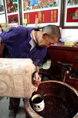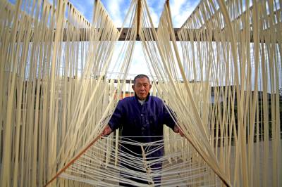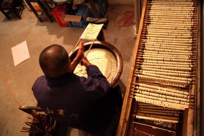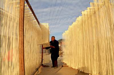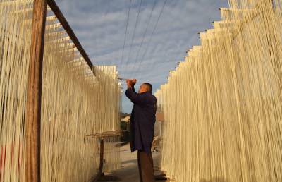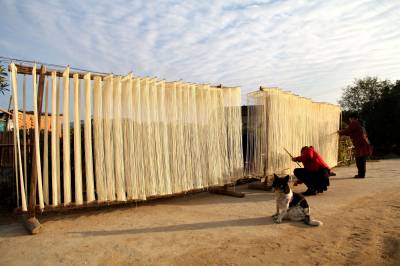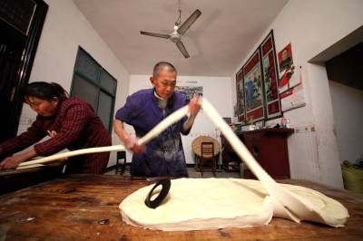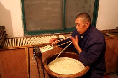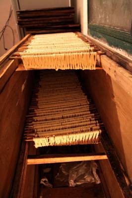 13日凌晨2点,张师傅用长50厘米、直径为1.5厘米两根小竹竿固定在面盆边木架的眼孔上,竿距约15厘米。将行好的面条开始在两根筷子竹上交叉缠绕,即“上筹”,将缠好的面竹分上下挂在木箱里的架子上,也叫“上箱”。5时许,上筹和上箱工序才全部完工。张师傅开始牵面了,门前摆放着几台面架,面架上下有两道横梁,相距1.9米,梁上满是圆圆的洞眼。张师傅把木柜内面条逐个取出,拿起一根筷子竹,插在上横梁洞眼上;再下拉另一根筷子竹,将面条扯长。扯拉三、四次后,开始“分条”,张师傅用两根削尖的竹签顺面棍插入,将拉好的面条左右分开,风干一半时,进行分条,先由上至下,再由下至上。条条缠绕在两根筷子竹的面条,被拉成了丝状,一帘一帘地垂下,煞是好看。晒干之后,取下切割整齐,扎上红绿纸条,便成为品相极好的手工油面。