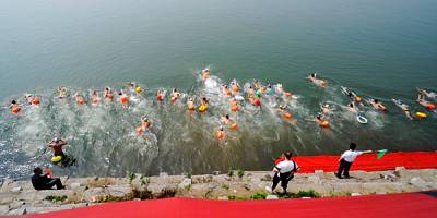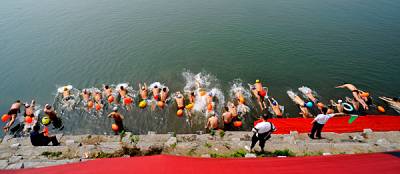 2010.05.02.来自全国各地的26支冬泳协会代表队的337名冬泳爱好者,参加襄樊市”万达杯”首届横渡汉江比赛。