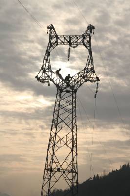 11月13日,迎着朝阳,供电工人正在110千伏守郭线铁塔上紧张施工。近年来,竹溪县通过招商引资,先后开发建设水电站 68座,年发电量达40万千瓦。为解决电力外送出口,该县供电部门多方争取资金5亿多元,兴建变电站,铺设线路 ,改造线网,使该县成为全省自办水电大县。 竹溪县委宣传部 喻泉源 摄