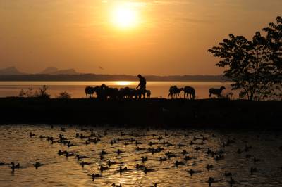 11月14日,嘉鱼县鱼岳镇南门湖村武侯坡农场夕阳余辉撒满密泉湖面,成群的山羊,洋鸭、麻鸭、林中土鸡围着主人胡曙光讨食,宛如一幅幅美丽的风光。