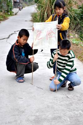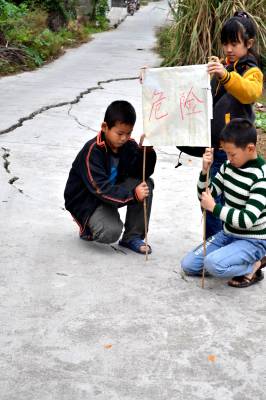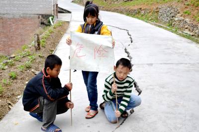 11月15日星期六,东坡小学的几名学生正在上学的危险路段插自制的安全警示牌。 巴东县官渡口镇东坡社区老三叉至东坡小学的移民公路由于受到重载车辆的碾压,加上前一段时间连续暴雨,雨水渗入裂缝,造成外侧不断下沉,致使路面裂缝增宽,给每天过往的学生和行人、车辆带来极大地安全隐患。居住在附近的小学生利用周假,自制警示牌,告诫此处——“危险!” (视界网 通讯员向国大摄)