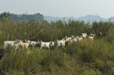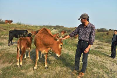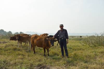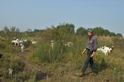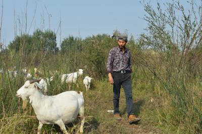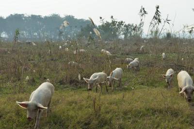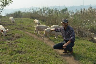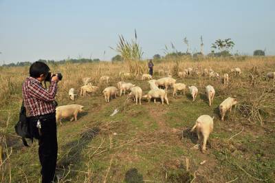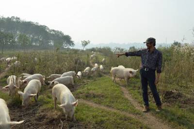 孤岛牧人张万虎 官洲是位于宜都市枝城镇境内长江江心的一个小岛,面积约3.6平方公里,在这里生活着一位牧人,他手下有230多头猪、240多只羊、48头牛、200多只鸡。这些动物们在这里自由自在的生活,待它们生长到能出售的时候,张万虎就用船将它们运到岸上,以比传统养殖高出一至二倍的价格出售。时不时还有游人到岛上与动物们亲密接触,张万虎风趣地说:“我这里饲养的动物是世界上最幸福的动物,它们都是自由的,在这小岛上,它们想到哪就到哪。”图为11月21日,张万虎管理岛上的动物们。