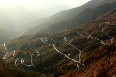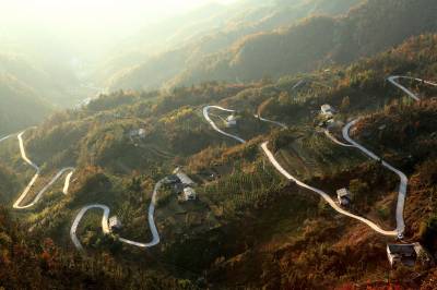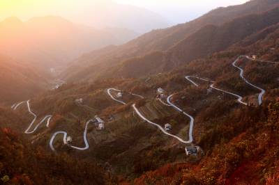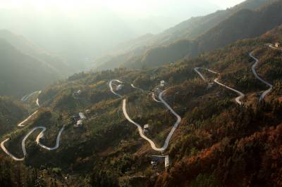 鄂陕交界的最美公路 11月20日拍摄的竹山县双台乡与陕西省安康地区白河县卡子镇交界的盘山公路。当日,鄂陕交界的双台乡青山村至白河县卡子镇卡子村2.5公里的断头路正式通车。这是竹山县累计建成的第25条省际断头路。 近年来,为破解农村交通难题,竹山县编制了《农村断头公路建设实施方案》,提出用3至5年时间打通与周边县市连接的31条省际断头路的目标,并明确农村断头公路建设不得低于四级公路技术标准,采用沥青路面或水泥混凝土路面。(视界网 章磊 摄)