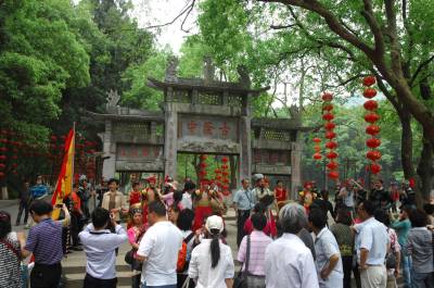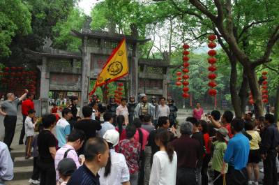 5月3日,市民在湖北襄樊古隆中牌坊下与演员扮演的诸葛亮互动,到当天,五一小长假期间,景区游客每天都突破万人,创历史最高记录。据介绍,由于今年实行了年卡制,并且加大了营销力度,开展了系列活动,推动了景区游客的快速增长。