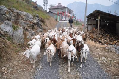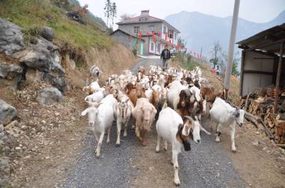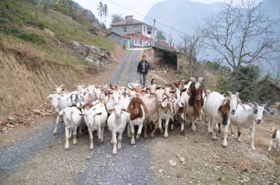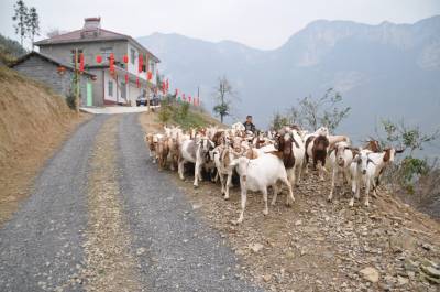 11月21日,为民羊业的老板杨立胜赶着羊群经过自己刚开张的农家乐。杨立胜是巴东县金果坪乡沙岭10组返乡青年。2012年,他响应巴东县委、政府全民创业的号召,放弃在上海打工月薪7000元的工作,带着妻子回到家乡,利用屋后千亩荒山发展山羊。通过3年打拼,山羊存栏量达300只。最近,他瞄准清江红色旅游开发良机,将小别墅改装成农家乐,在房前屋后种上绿色无公害蔬菜,专门宰杀自产的山羊和林下的土鸡让游客品尝。据他讲,开办农家乐,不仅为自家的山羊找到一条固定销路 ,更重要地是通过农家乐这个平台推销纯天然喂养的山羊,解决沿江农民养羊的后顾之忧。