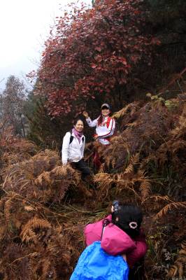 11月22日,宜昌市一户外徒步群的“驴友”们冒雨在三峡芝兰谷景区内开展徒步活动。