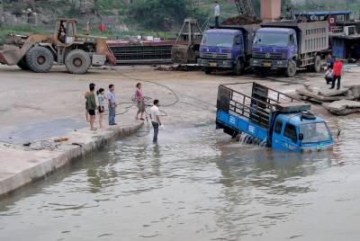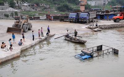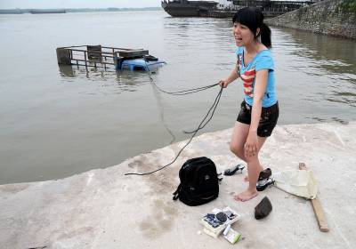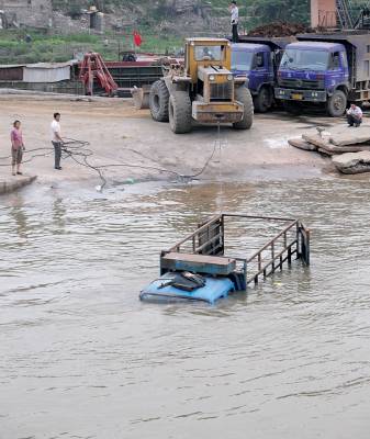 江边洗车车溜江中5月3日,黄石市一名司机为了节省洗车费用,将车开到海观山码头江边清洗。不知道是刹车失灵还是忘了刹车,正当司机准备洗车时,车子自己溜进江水中。司机放在驾驶室的笔记本电脑、手机等被江水打湿。该司机划着船儿将钢丝绳系住车梁,叫来一台大铲车才将车子拉出江中。事后,该司机感慨地说,再也不到江边洗车了。图一:一名女孩用绳子拉住车头,怕车子继续下溜。图二:划着船儿来救车。图三:大铲车准备拉车。图四:成功将车子拉出江水。黄石市黄石日报摄影部邱孝威摄影报道
