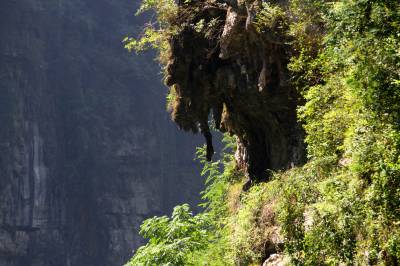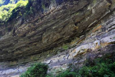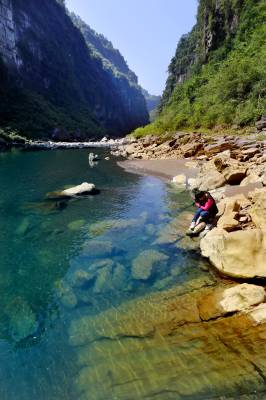 两岸是垂直江面的悬崖,雾已散去,阳光射在崖壁上,放出耀眼的光芒,崖缝里挤出的树技,拼命的向空中生长,在绝壁之上展示自己顽强的生命力;就在这片崖壁之上,随处可见亿万年滴水形成的石钟乳,在阳光下一律呈现暗褐的颜色,滴落的水滴在空中被风一吹,立刻变成了丝丝飘逸的小雨,轻盈的洒落在郁江之中,如泣如诉,如诗如歌;一往无前奔腾不息的江水,就象生生不息顽强繁衍的郁江两岸的土苗儿女一样,热情奔放,百折不挠,它们在山谷中、在岩石间穿行、歌唱、冲峰、呐喊,它们胸怀着雄鹰飞翔的蓝天,向往着无边无际的大海,用一生去追求海一样深沉的大爱,用消溶自己生命的结果,生成不涸的永恒,这是生命的真谛,这是至高的境界!