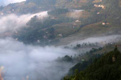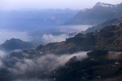 离开文斗集镇,前往五里峡,我们一头钻进了云雾之中。