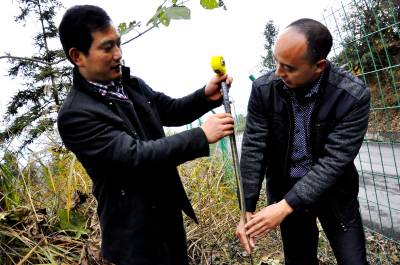 11月26日,在恩施市红土乡红土溪村曾三湾组,验收人员正在测量长防工程补植补造建设质量。