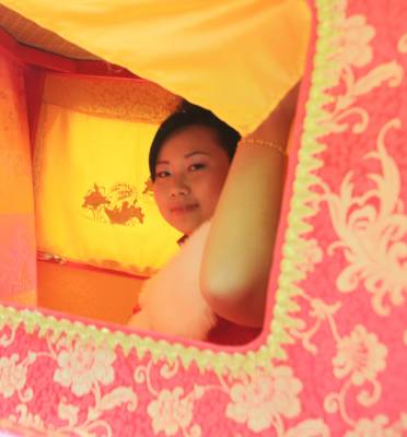 国家AAAA级旅游景区神农溪畔,一场低碳婚礼举行,新娘系神农溪国际旅行社导游,乘坐低碳大花轿出嫁.