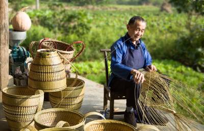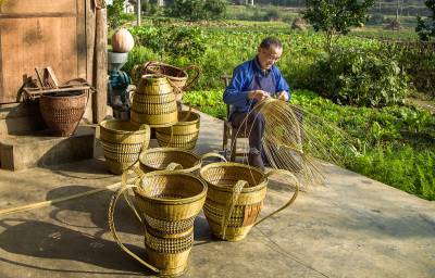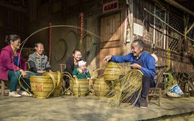 图为2014年10月22日,村民正在观看竹艺大师扬天桃为当地一农户家编织花背篓。当时,扬天桃师傅将手中6米多长的两根篾条熟练而轻巧地甩了出去,在空中画了一个大大的椭圆,不偏不倚地落在了他的正前方,顿时惹得在场围观的人哈哈大笑起来。