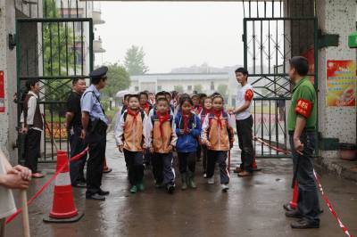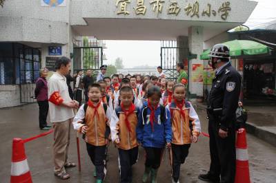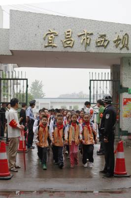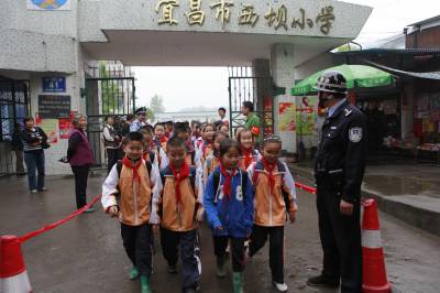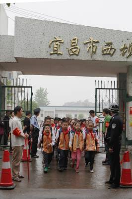 宜昌织牢校园”平安网”5月4日下午,宜昌市西陵区西坝小学的小学生在民警和义务巡逻队员护送下放学返家。连日来,湖北宜昌市在校园周边开展”平安网”活动,在学校大门前设立红线,当地警方及老师、家长组成的护校队伍将在校园周边巡逻,确保学生安全和校园稳定。本报视界网黄翔摄