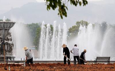 劳动创造美4日,黄石市几名园林工人正在磁湖山庄广场前挖土施工,在喷泉的映衬下,园林工人如同一道风景线,是他们的辛勤劳动创造了我们城市的美丽。黄石市黄石日报摄影部邱孝威摄电话:13807232603邮编:435002