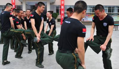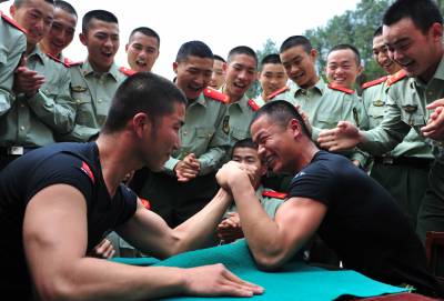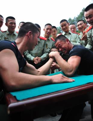 5月4日,武警恩施州支队直属一中队的官兵正在进行掰手劲比赛。当天是五四青年节,武警湖北总队恩施州支队直属一中队举行掰手劲、斗鸡等趣味比赛,官兵们在笑声中快乐度过五四青年节。视界网杨顺丕通讯员孙俊涛摄