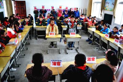 明日是“全国法制宣传日”,当日,湖北省郧县柳陂镇中心小学组织六年级学生开展“模拟法庭进课堂学法”实践活动。学生们通过生动形象地现场案件“模拟”庭审,再现整个“审案”程序过程,鲜活地学习法律知识,增强“依法治国”观念和守法意识,从而更好地学法、懂法、守法。