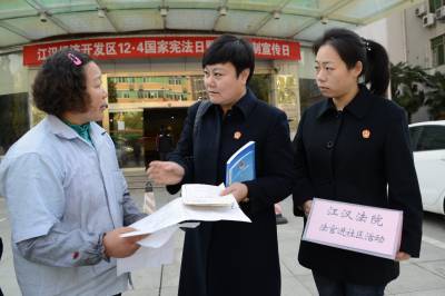 12月4日,是全国首个宪法日和第十三个法制宣传日。当日,湖北省武汉市江汉区人民法院,开展了法院开放日、法官进开发区、进社区、进市区宣传现场等丰富多彩的宣传宪法,提供法律咨询的活动,深受广大群众的欢迎。"全国优秀法官”和“湖北省优秀共产党员”该院民事审判第一庭庭长郑小红(中)与同事们,在江汉经济开发区进行宣传宪法,为农民工提供房产纠纷法律咨询。