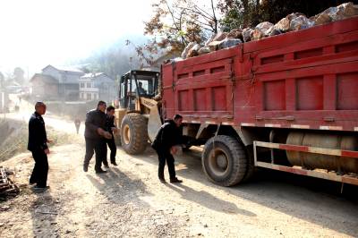 12月8日11点,在谷城县小沟至盛康的公路筒车村路段,一辆满载矿石的货车因传动轴断裂停在一上坡处,司机去买新轴走了,顿时堵塞了上下各种车辆通行。正值中午,上下客车上的男女老少、大人小孩又饿又渴,非常焦急。在货车司机至下午1点仍未来的情况下,有人只好打手机向交警求助。半个小时后,谷城交警大队盛康中队中队长龚维平、指导员孙国勇赶到现场,调来在附近修路的铲车推车。孙国勇指挥铲车司机推车,龚维平带头和其他司机一起搬石头垫住货车的两个后轮。经过半个小时的努力,大货车被顺利移到了路边,上下交通立即恢复。从11点被堵到2点的各种车辆和众多的乘客终于都开始走了,乘客们都对两位交警赞不绝口。图为孙国勇(左一)在现场指挥推车,龚维平(左三)和司机一起搬石头垫货车。