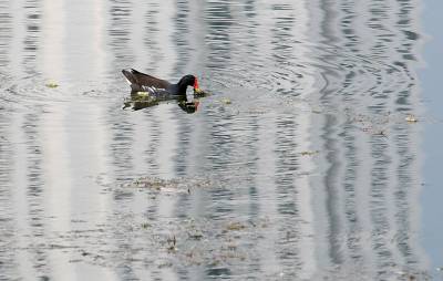 黑水鸡重现磁湖4日,记者在黄石市磁湖山庄西边的湖面上发现一只奇异的红嘴鸭在觅食:此鸭全身除翅膀和尾部有少许白色外,全是青黑色,嘴巴尖尖、嘴后部分地方呈红色。记者随后到市野生动物保护站了解到,这种水鸟不是鸭子,而是秧鸡科的黑水鸡,俗称红骨顶,脚上无蹼,嘴是尖的而不是扁的。黑水鸡栖息在有挺水植物的淡水湿地、水域附近的芦苇丛、灌木丛、草丛、沼泽中。30年前,磁湖常见黑水鸡的影子。后来,由于磁湖污染,黑水鸡在磁湖渐渐消失。现在,黑水鸡重现磁湖,表明磁湖水质在好转。黄石市黄石日报摄影部邱孝威摄电话:13807232603邮编:435002