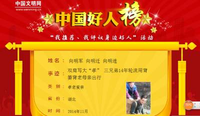 今年8月22日,向氏三兄弟的母亲因突发心脏病去世,享年88岁。而今,“背篓孝子”用双肩感恩母亲的养育、用耐心恒心书写平常而又不简单的“孝”字的孝道精神在山乡广为传颂。“中国好人榜”这样介绍向氏三兄弟:一个竹筐,两根肩带,组成一副背篓,全聚仁者精华。一箱墨迹,民族瑰宝,浓缩六字家训,吸收传统精髓。向家的孝道,没有惊天动地,却可以打动每一颗尚善之心,可以影响每一户百姓家庭。视界网 张国荣 摄
