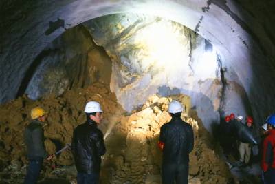 12月10日,利万高速公路谋道连接线齐岳山隧道,专家和工程技术人员在施工现场研究隧道顶部溶腔不良地质处置方案。