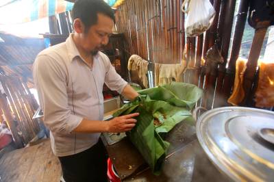 烤熟之后,敲掉包裹在鸡肉表面的泥层,鸡肉的香味夹杂着芭蕉叶和粽叶的香气一下子就四溢出来,让人口水直流。