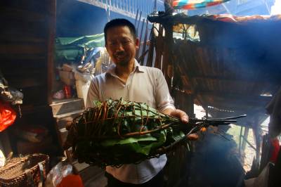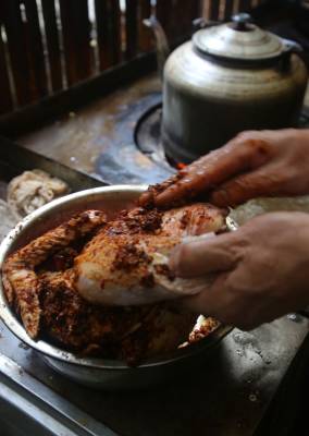 将鸡取出,开始为烤制做最后一道准备工作。在鸡的两腋各放一颗丁香夹住,再用猪网油紧包鸡身,用芭蕉叶包一层,外面再包一层粽子叶,然后用细麻绳扎牢。猪油的作用是能让鸡肉更加滑嫩。而芭蕉叶和粽子叶的作用一是能保护鸡肉不被烤焦,二来是使鸡肉更增添一种树叶的清香。