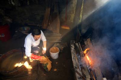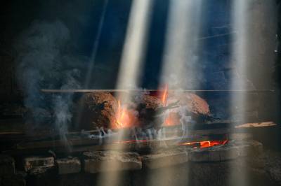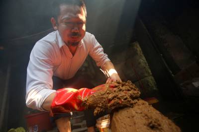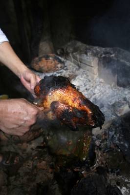 把裹好泥巴的鸡放入自制的炭火坑中烤,把火烧旺,烤40分钟。整个过程需要杨师傅不断的翻动,让鸡肉平均受热。在大火的炙烤中,半个小时后,鸡肉表面包裹的泥层开始出现干裂,还需要用新鲜的泥补塞裂缝,以锁住鸡肉的香气。补好裂缝后,再用旺火烤30分钟,然后改用小火烤一个小时,才算是完成,整个过程不断翻动,不然鸡肉受热不均,味道就损失一大半。
