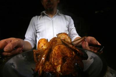 敢在一道菜的名字里加上自己的姓氏,这充分说明了杨师傅的自信和这道菜的独到之处。从制作时间上就表明了这一点,一般烤一只烧鸡公大约需要3个小时左右。而且你一定不要怀疑为什么要用这么长时间,因为这个时间不是凭空来的,而是杨师傅经历几百次的实验的来的,就是需要这么长的时间烤出来的鸡才好吃。正因为如此,这道菜在杨师傅这儿,可不是随时都能吃上的,由于全程手工制作,加上都是现杀现烤,工艺复杂,耗时较长,所以一天也做不了几只。