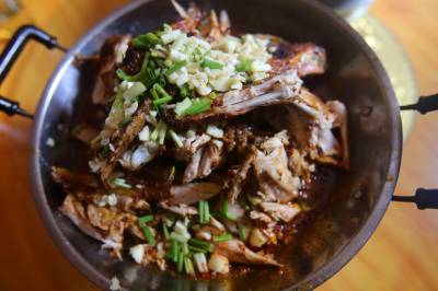 解去绳子,揭去粽子叶,淋上香油。再把鸡肉撕碎,放入先前准备好的辅料当中,一道烧鸡公的干锅就完成了。也可以备香油、葱白、甜面酱等调料调制的蘸酱,蘸着吃也别有一番风味。