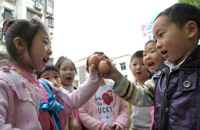 传统民俗过立夏昨日,荆门市机关幼儿园的小朋友们在老师的带领下玩顶蛋游戏。5日是立夏节气,荆门市东宝区龙泉街道龙山社区居民与幼儿园小朋友们一起吃咸蛋,开心地玩顶蛋、称体重等民俗游戏,寻找曾经消失的民俗乐趣。郭立罗晓菊摄
