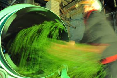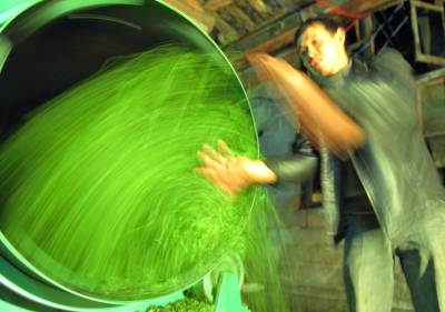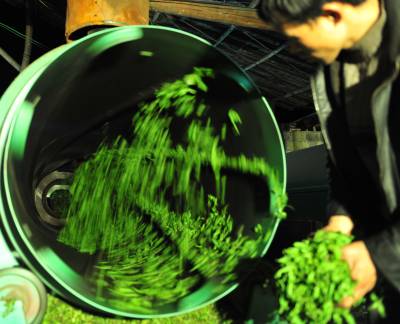 4月23日,利川市毛坝乡硒源茶厂的工人正在翻动收购的春茶。眼下,茶乡毛坝迎来春茶收购加工的高峰期,该乡茶叶加工厂平均每天可收购鲜叶30万公斤,交易额达200多万元。视界网杨顺丕通讯员单绪林摄