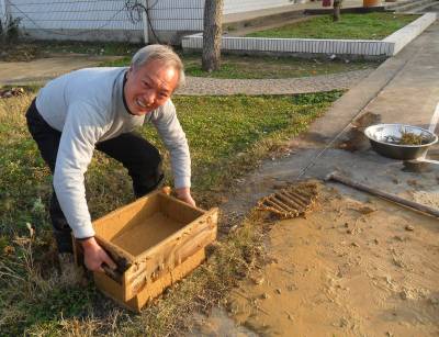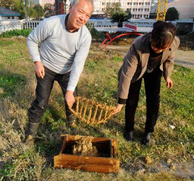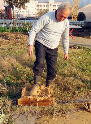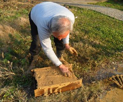自古至20世纪80年代末,乡村绝大部分民众建房都使用土砖砌墙。土砖生产程序为:选好适合脱砖的稻田,收割稻谷后灌水,把泥土翻耕两遍,切断水源,让稀泥闷至半干。将稻草轧成六七寸长,作为土砖的牵草加入泥土中,用牛把泥草踩烂踩活成砖泥。脱砖的木制模子叫砖母子,由两块长1.65尺、两块长0.92尺、宽均为0.48尺、厚半寸的木板夹成长方体,两头镶有结实的木棒,用于脱砖时双手提起砖母子。两人一班,一人用钉耙挖砖泥放入泥蔸子(用七根短木棒和草绳编成)中,然后两人抬着泥蔸子把砖泥倒进砖母子,一人带着泥蔸子又去装砖泥,另一人用脚踩实砖泥并用手把上部抹平,然后双手水平端起砖母子,一口土砖便从砖母子里脱了出来。湿土砖7天左右变硬,把砖搬动侧立起来,用砖铲子铲除底部和四周不平部分,整齐堆码在田间,上盖稻草,让其自然干透,此称铲砖和码堆。一块干砖一般重50余斤,建房时挑回去砌墙。1986年,宜昌县分乡区有土砖屋12768栋。1990年以后,使用砖母子脱砖的习俗消失,建新房者均使用火砖或免烧砖。2013年,宜昌市夷陵区分乡镇内仍有3863户住老土砖屋。(本报视界网 袁国悦 黄定美摄影)