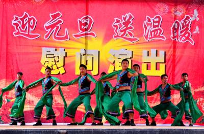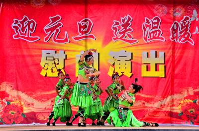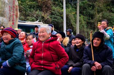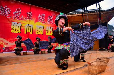 12月18日,恩施州宣恩县长潭河侗族乡两溪河村村民在自家门前的风雨桥旁观看县非物质文化遗产传承展演中心的演员带来的极具民族特色鲜明的文艺演出。 当天,该县文体局前往党建扶贫点两溪河村为村民送文艺演出、科普图书和健身器材,在寒冷的冬日给他们送去了温暖。(本报视界网 肖美摄)