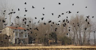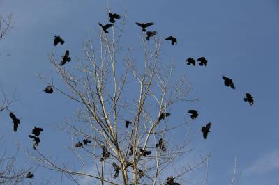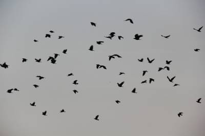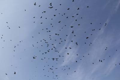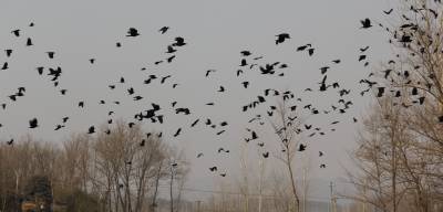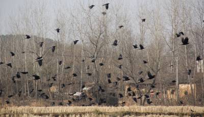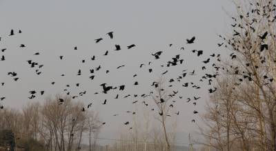 12月22日,逾千只黑鸟在安陆市王义贞镇汝南村翔集。近几年来,安陆市以创建“现代农业强市、文化旅游名市、生态宜居城市”为抓手,坚持植树造林,封山育林,改善环境的工作目标,使全市的森林覆盖率大为提升,万亩银杏景观获得2014年“中国美丽田园”称号。 (本报视界网:王代金 高全涛 摄影)