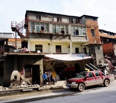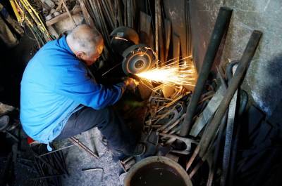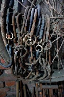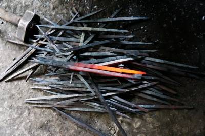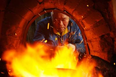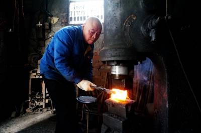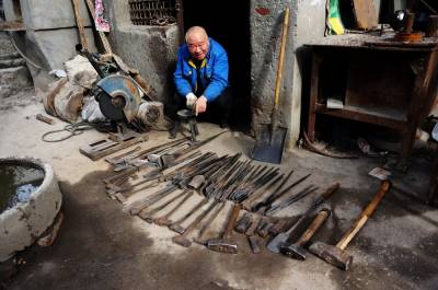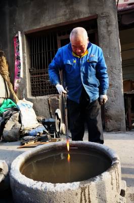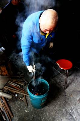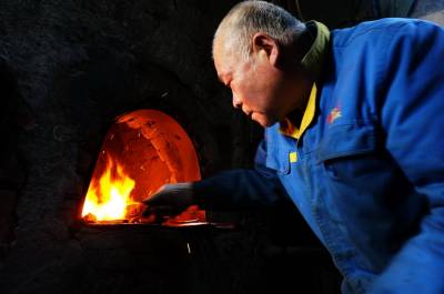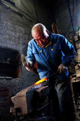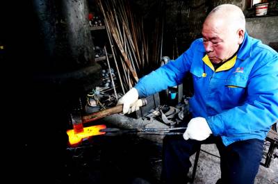 阮世昌老师傅1966年19岁时在老家南化塘镇跟二爹学习打铁,1976年他自已到刘洞镇开起了自已的铁匠铺,他打制的各种农具等销路较好,周边乡镇庙会大集上都有他打制的产品并成为抢手货,由于村镇人囗有限,1984年阮师傅一家进城发展,花25000元钱在国道旁盖起300多平米的3层楼房和铁匠铺,这一干就是30年,如今由于年龄偏大体力多有不支,他花8000多元钱从河南买回一台80公斤气锤帮助他打大件。阮师傅说:"现今铁制商品到处都买的到成品货,可是城乡仍离不开铁匠铺,手工打制各型奇特的工具需求仍然较大,每个月除去水电费,1000斤焦碳,原材料,月收入仍在万元左右,可是明年城北路拓宽建设一搬迁,我的铁匠铺是否开的下去心里真没的底,想想都睡不好觉"。