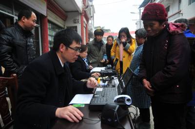 惠农银行进村 12月23日,恩施市芭蕉侗族乡黄泥塘村级综合服务社,农户们挤在中国建设银行“村寨流动银行”咨询台前,现场领取“裕农通”银行卡。手持“裕农通”银行卡,农户“人不出村、足不出户”,就能完成小额现金流转、异地汇款、持卡消费、购买农资、自助贷款还款,还能得到短信提醒账户余额变动等金融服务。 视界网 刘伦 摄