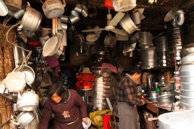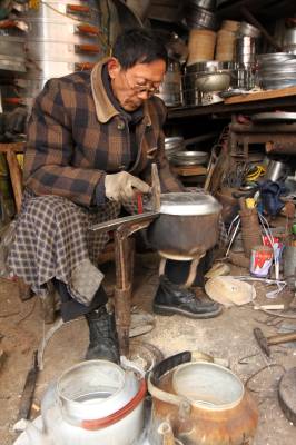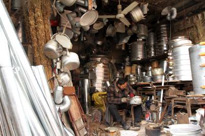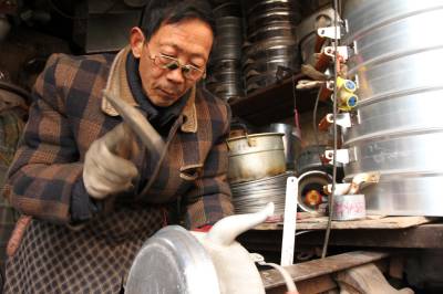 刘师傅的作坊只有一间门面,房屋还是民清时代传承下来。他主要加工市面上很难买到地铝合金小蒸笼、白铁皮烟筒、喷壶、煤球灶,维修钢筋锅、烧水壶、炭火锅等小五金用品。