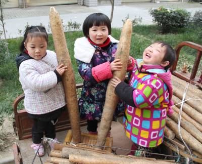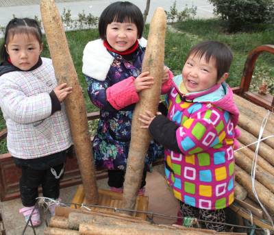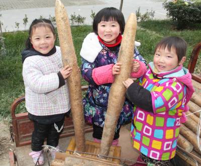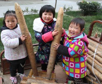 山药丰收了 12月27日,冷集镇3个农家孩子正高兴的拿着山药合影留念。2014年,种植有2万亩“绿色”山药的谷城县冷集镇农民,科学栽培,精心管理,山药获得了亩平4000公斤、最高7000公斤的好收成,就连农家孩子也乐开了花。 视界网马明刚摄