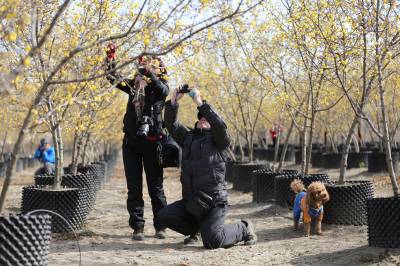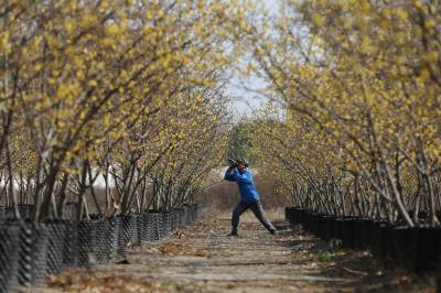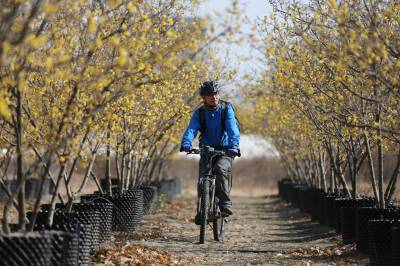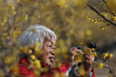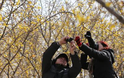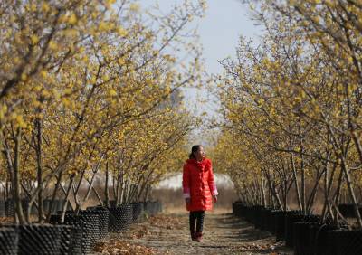 2014年12月31日,一市民在鱼梁洲欣赏腊梅花。襄阳市采用高温热水解预处理和高效厌氧消化技术,将污泥与餐厨垃圾变成生物炭土,培育苗木。目前,用这些炭土已供养3万株紫薇、桂花、红叶石楠等植物。
