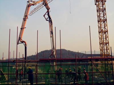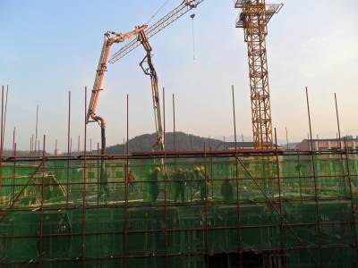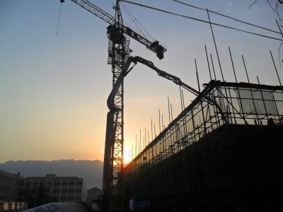 早上七点多钟,建筑工人在施工中迎来新年第一缕阳光。当日是2015年元旦节,宜昌市夷陵区分乡中心完全小学学生宿舍楼施工现场一派繁忙,工人们精心浇筑混凝土,迎接新年的到来。(视界网 袁国悦摄)