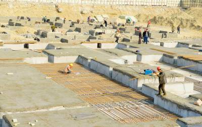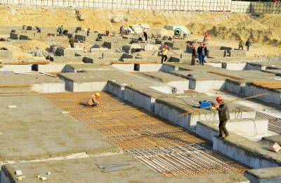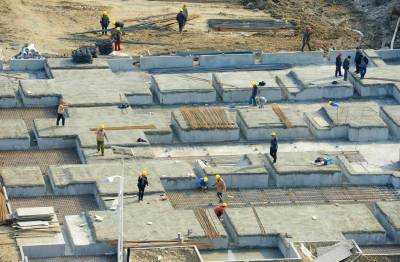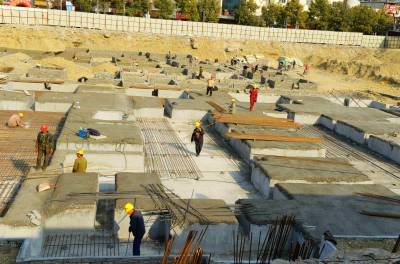 2015年1月1日,工人在保康县文体中心建设工地上紧张作业。 当日是新年元旦放假的第一天,但是有很多行业的人们不能放假休息,仍然坚守在工作岗位上,用辛勤的劳动迎接新年的第一缕阳光。(视界网 陈泉霖 摄)