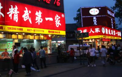 在解放大道精武路口,两家以卖鸭脖为名的店家均号称精武”第一家”,一些外地慕精武鸭脖之名而来的游客见两店家如此近同的招牌不由糊涂了:究竟谁是精武”第一家”?张垠摄江汉区园林局430022