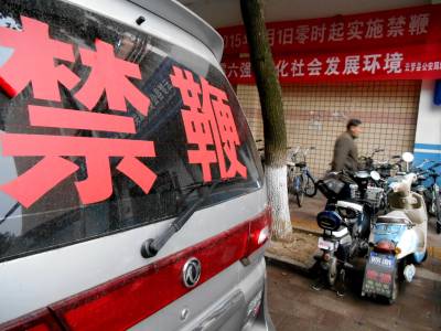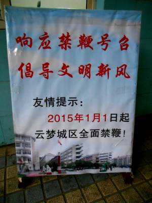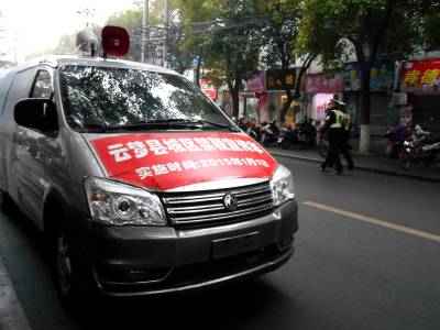 2015年1月5日,一名行人从云梦禁鞭宣传车边走过。从2015年1月1日零时起,云梦城区全面实施禁鞭,受到居民的普遍响应、支持和欢迎,元旦节日期间禁鞭区没有听得鞭炮声,居民度过一个祥和、宁静、环保、卫生的元旦假日,禁鞭取得良好效果,