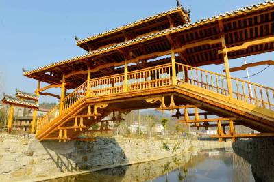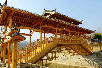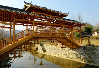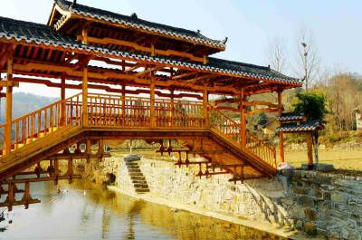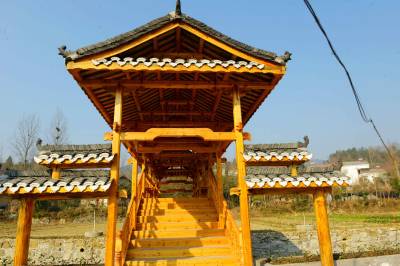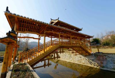 蓝天、白云、村庄,小桥、流水、人家……走进保康著名茶乡——店垭镇格兰坪村,仿佛走进了一幅天然山水画中。绿色的茶园,古朴的廊桥,亲切的乡音,让游客流连忘返。 近年来,店垭镇把绿满保康建设与美丽乡村建设有机结合,着力打造格兰坪最美乡村,让“看得见山、望得见水、记得住乡愁”成为现实,保留了原始传统自然村落的美丽。这是日前拍摄的店垭镇格兰坪村新建的风雨廊桥。(视界网 陈泉霖 摄)