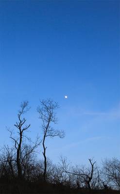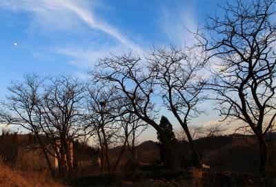 新年的第一天,阳光散发着炫目的光芒,照耀着在每个即熟悉又陌生的角落;湛蓝的天空如洗,白云飘洒,在一望无际的苍穹里弥漫;弯弯的月亮也禁不住露出笑脸,俏皮地探出头来,与光秃而苍劲的树干媲美。