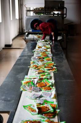 1月8日,十堰渝川食品有限公司的员工们正在生产线上紧张有序地进行渝川“武当红”泡菜装袋装箱工作。2014年该公司生产的48个品种的精品泡菜销往全国20多个省市,并在武汉、北京、上海、广州等省级中心城市设立办事处和服务网点,年创产值1亿多元,上交利税200余万元。 视界网周家山摄