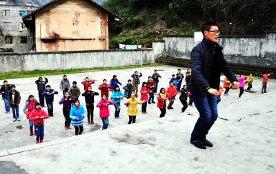 9日,巴东县火峰初中教师谭庆大正在体育课中教授七年级学生啦啦操。为丰富学校体育教学和阳光体育活动的内容,该县教育局专门举办全县中小学啦啦操教师培训班。从即日起 ,巴东县各校掀起了学习啦啦操热潮。(视界网穆世祝摄)15335850858